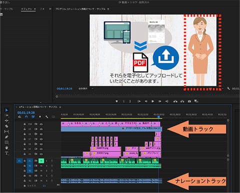 1.Premiere Pro、PowerDirectorなどの動画編集ソフトに取り込むのはカンタンです。動画編集時に、画面上でアバターを配置する場所をあらかじめ開けておきます。
