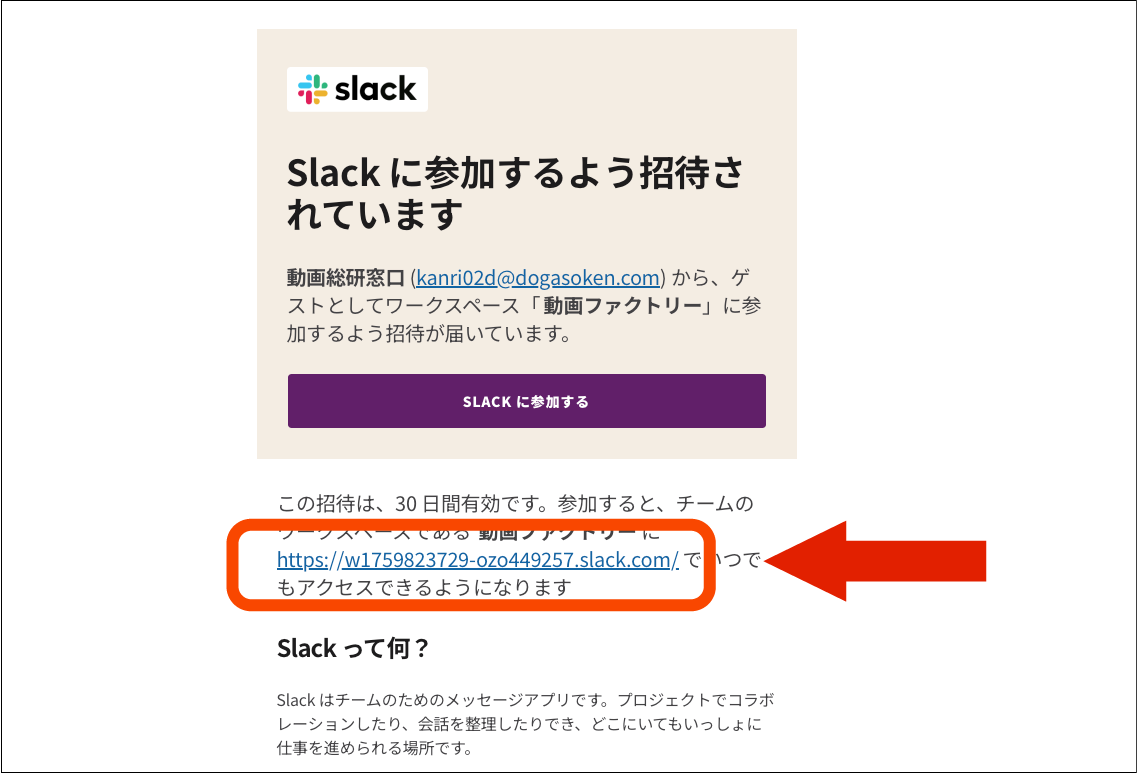 ご発注直後に、「Slack に参加するよう招待されています」という電子メールが届きます。上記の画像のようなHTMLメールです。矢印で示された文字列をクリックしてください。(「SLACKに参加する」というボタンの方はクリックしないでください。)