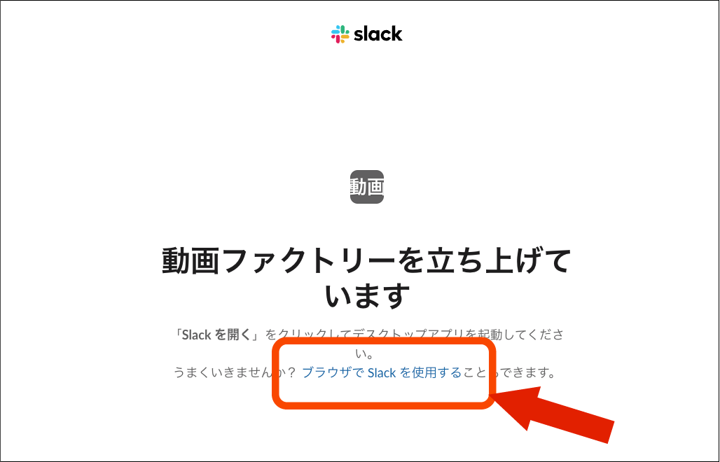 この中の「ブラウザでSlackを使用」という色違いの文字列をクリックしてください。その上の行の「Slackを開く」の文字列は、インストールされたアプリケーションを開くためのものですので、ここではクリックしないでください。
