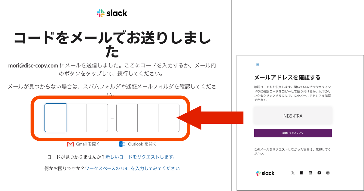 「ブラウザでSlackを使用」をクリックすると、eメールで確認コードが届きます。これをブラウザ画面に入力することでログインできるようになります。