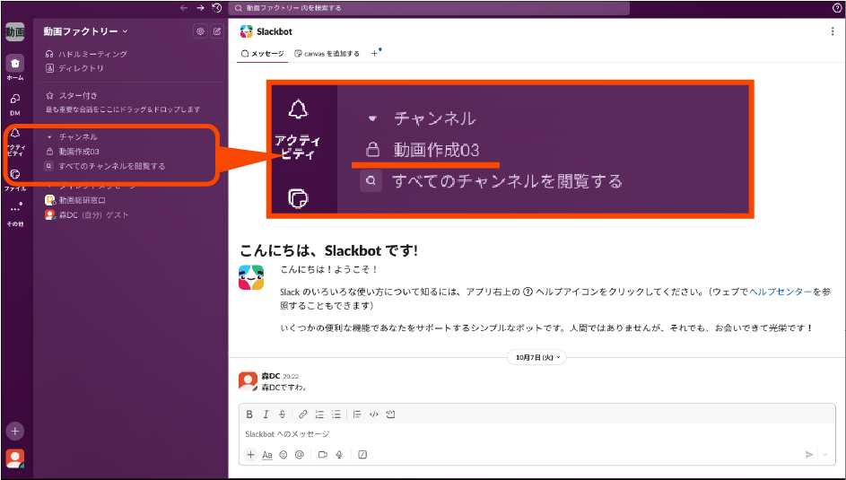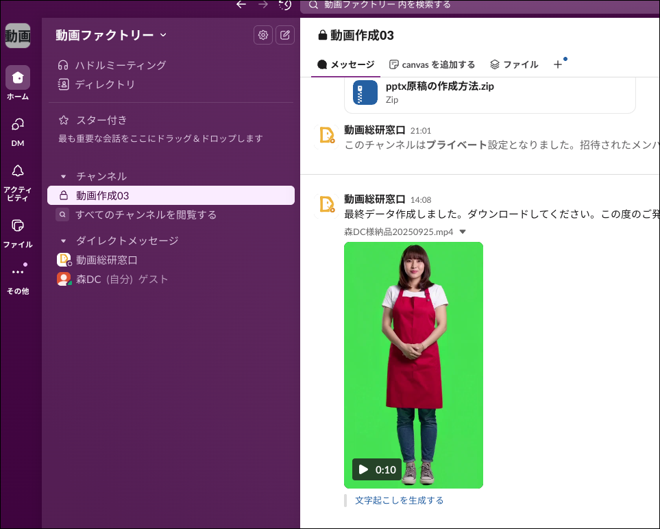 チャンネルに入ったら、ここで動画ファクトリー事務局と具体的なやりとりを行なってください。