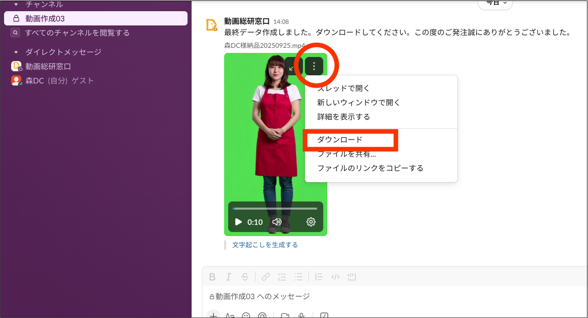完成したら、その旨電子メールでお伝えするとともに、Slack上にアップロードいたします。お客様はブラウザのSlack画面から、ワンクリックでダウンロードできます。これで納品は完了です。